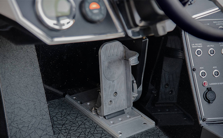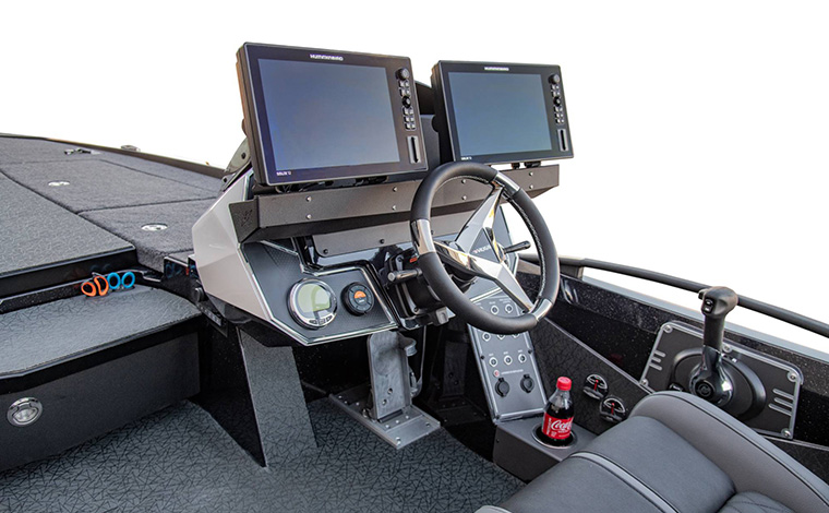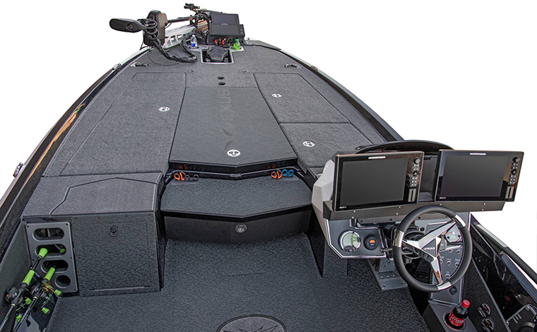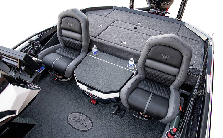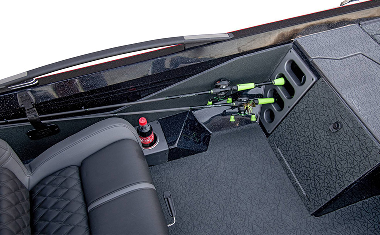 幅広いバウは、トローリングモーターを効率よく組み込むだけでなく、複数のアングラーに広いスペースを提供します。収納は、湿気対策としてエアアシスト付きの蓋、湿気に強いステンレス製の圧縮ラッチが備わっています。大きなフロントデッキの下には、広々としたスペースがあり、ロッドの収納能力も膨大です。ポートコンパートメントには、多くのロッドを収納できるスペースを備えています。 運転席のコンソールはスタイリッシュなデザインで最大16インチの魚探が装着でき、スピードメーターや燃料計など複数のゲージが見やすく配置されています。助手席の足掛けに折りたたみ式収納ボックス、運転席コンソールの下のフットスロットル用の追加スペース、そして当社独自のカップホルダー付きCold Spot™ クーラーがあります。また、運転席と助手席の両側には収納ボックスがあり、日焼け止めや携帯食料などの小物を収納するのに最適です。