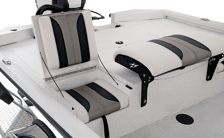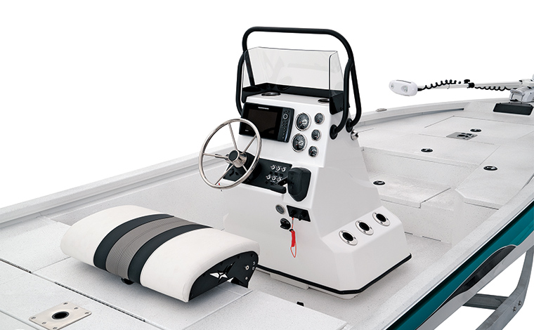 広々とした歩きやすいレイアウトの足元にはLEDの照明があり、コックピットのファイバーグラス製コンソールにはスピードメーター、タコメーター、トリムメーターと水圧計、魚群探知機類が搭載。マルチポジションシートはドライバーの好みに合わせて調整ができ、折りたたみ式のジャンプシートは、デッキスペースをより広くするだけでなく、友人や家族が乗っても充分なスペースを生みだします。