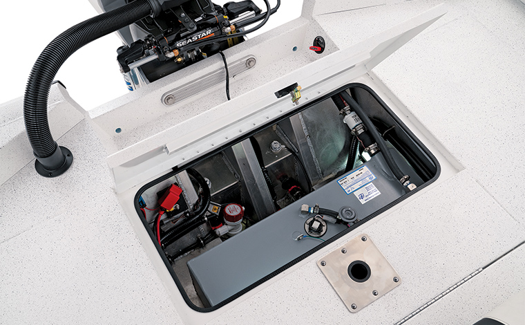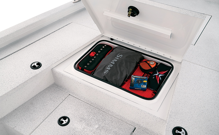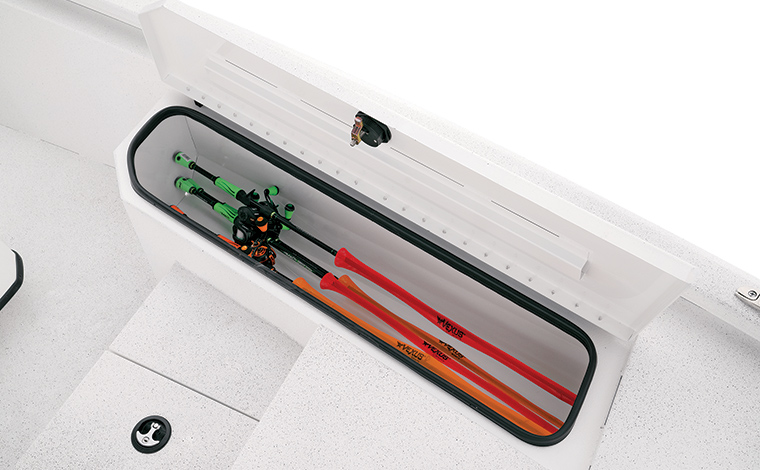 2つの8.5フィートのロッドボックス、ビルトインステップクーラーに加え、大きな鍵付きのストレージなど、船内のいたるところに収納スペースを備え付けられています。リアストレージは開口部も内部も広い設計です。
